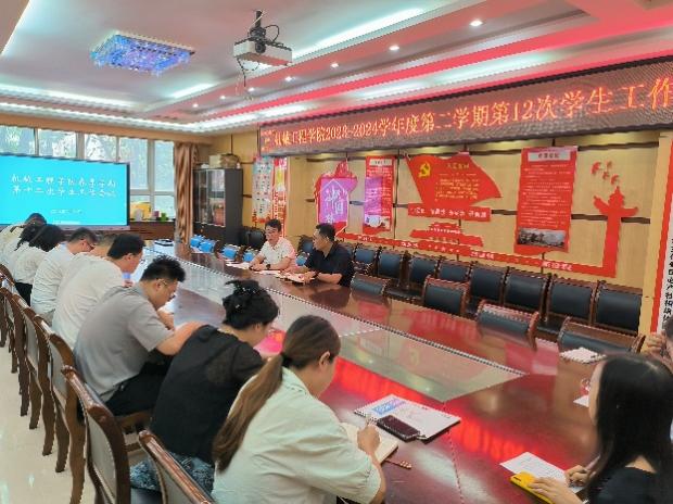 7月12日下午,在2号教学楼208会议室,机械工程学院召开2023-2024学年第二学期第12次学生工作会议。学院党总支书记衡斌、副书记周建军及全体辅导员班主任参加会议。此次会议从2021级毕业未就业学生的跟踪帮扶工作、2022级学生顶岗实习安全工作、学生假期安全警示教育、新生入学准备工作等方面进行全面部署。