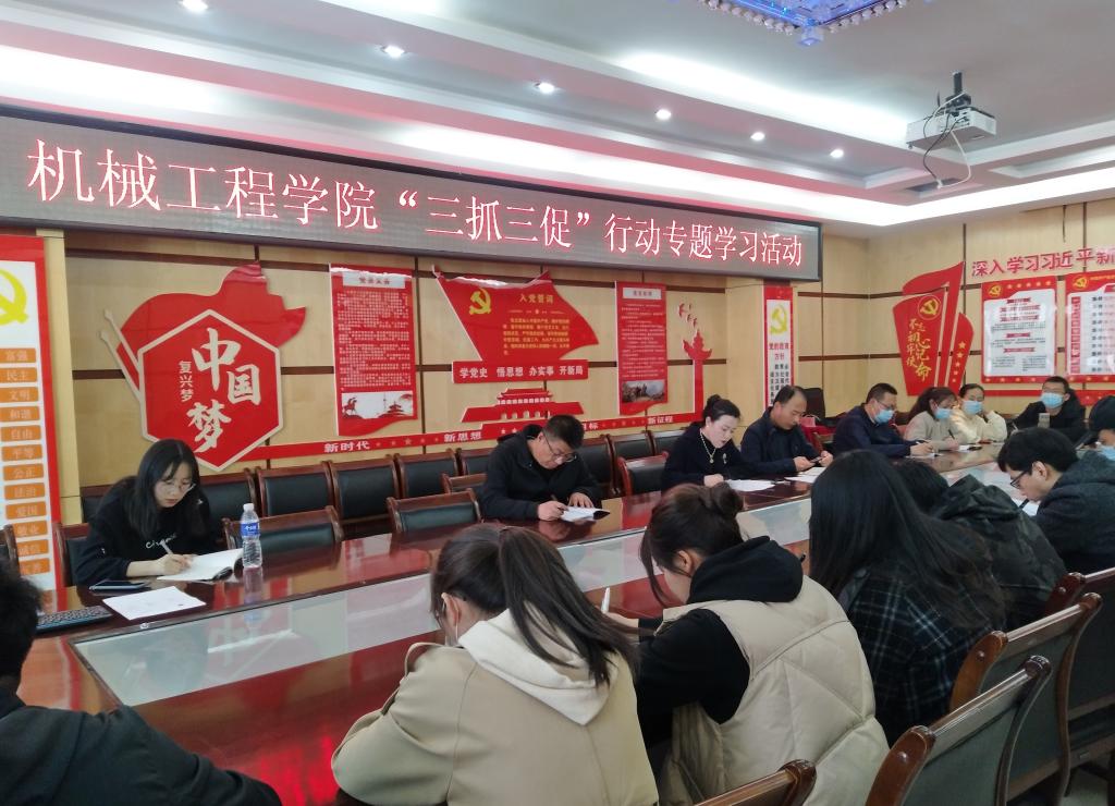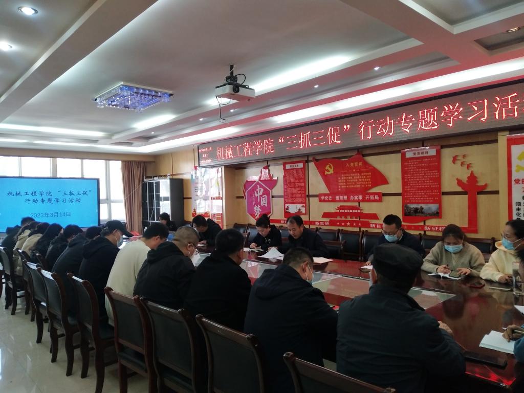 3月14日下午,机械工程学院组织部门全体教师学习甘肃省委组织实施的基层治理创新 “三抓三促”文件精神,紧扣宗旨抓学习促提升、抓执行促落实、抓效能促发展。院长张田荣围绕“三抓三促”行动部署要求,引导全体教师潜心教书育人,抓学风建设,促人才培养质量。