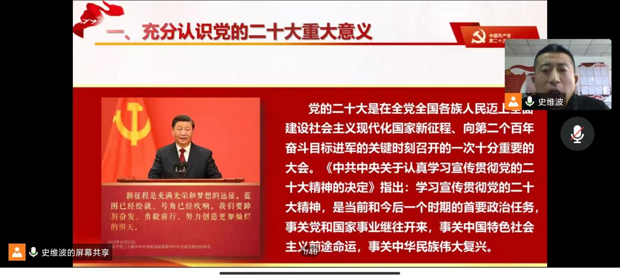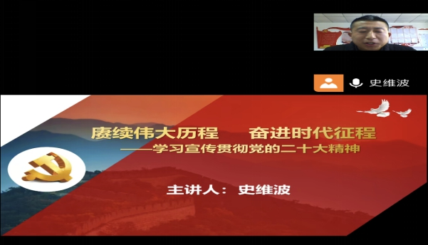 根据省教育厅有关工作要求和学校党委的安排,为全面深入学习、领会党的二十大精神,引导广大师生把思想和行动统一到党的二十大精神上来,2023年1月6日下午机械工程学院党总支组织所属机械工程学院、工业中心全体教职工和机械工程学院部分学生,由全省高校学习宣传党的二十大精神师生巡讲团成员、学校马克思主义学院副院长、副教授史维波为基层教学单位146名师生,以《赓续伟大历程,奋进时代征程》为题,开展了线上二十大精神专题宣讲。