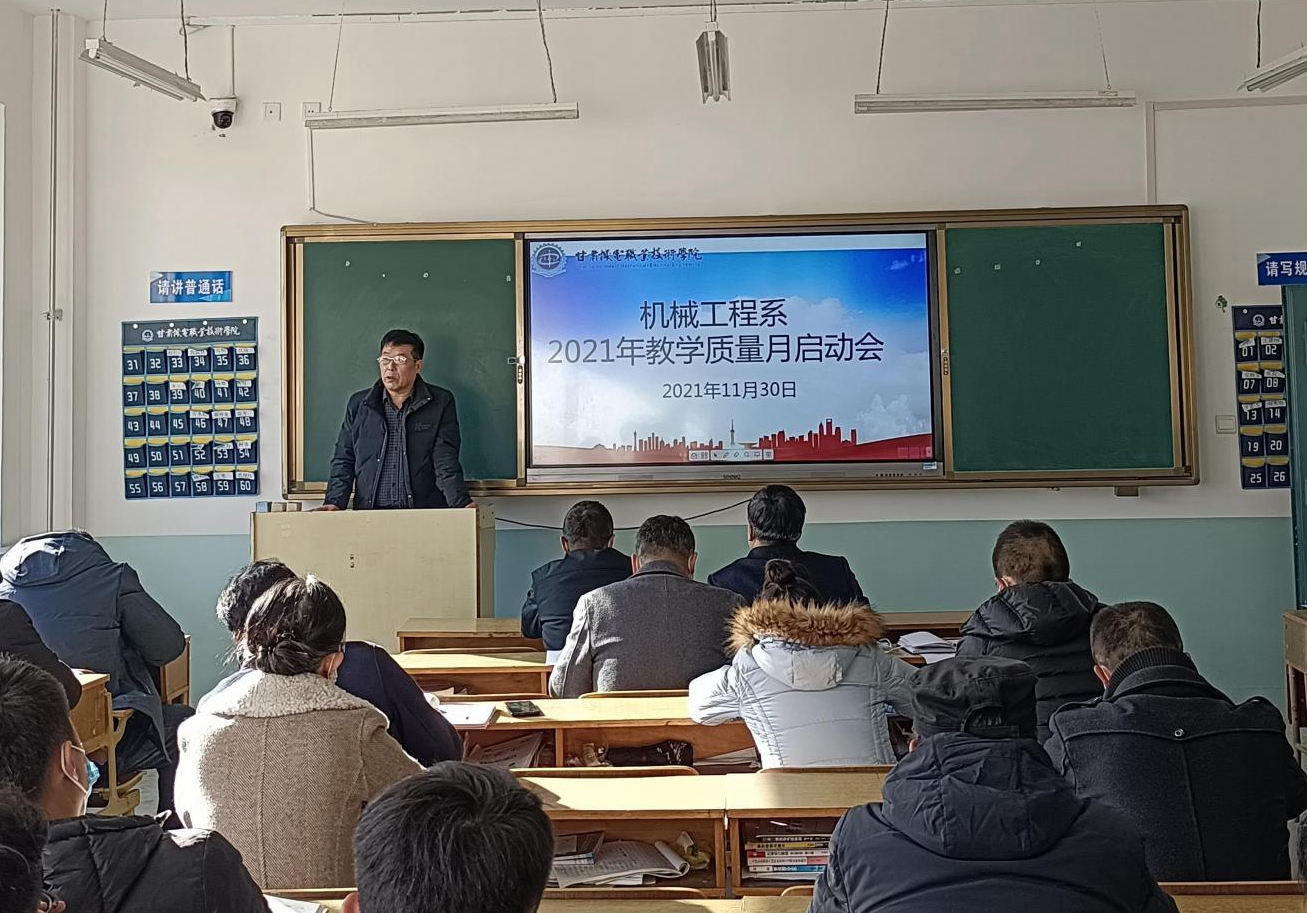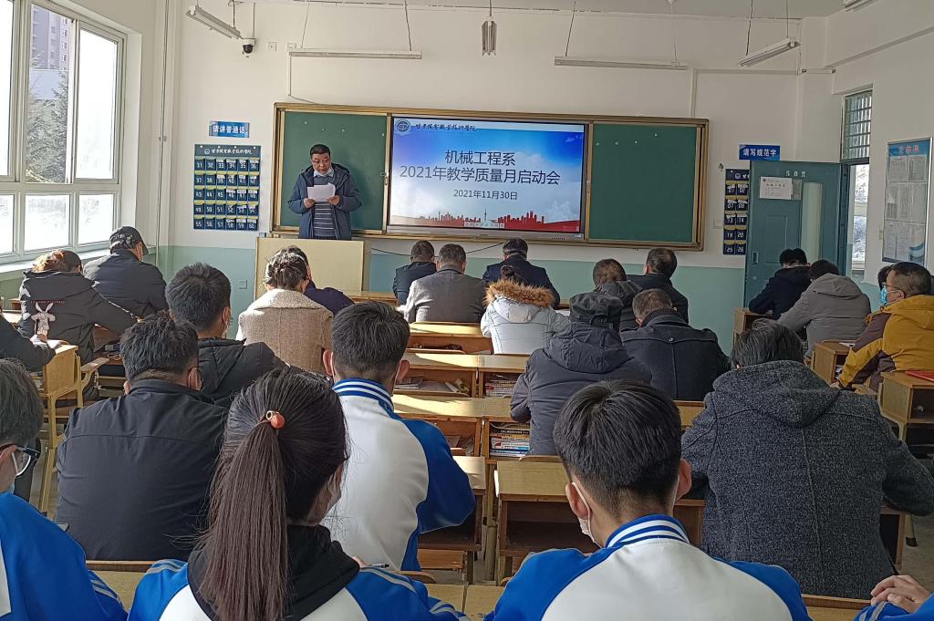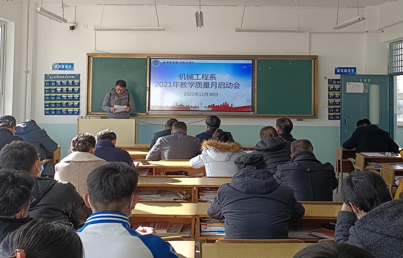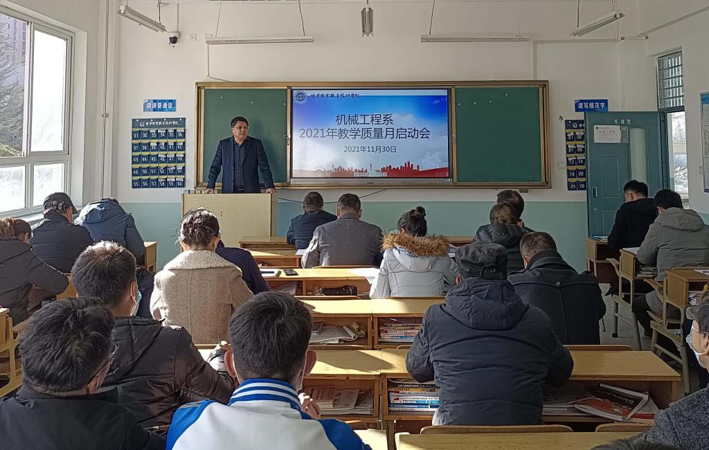 为确保学院2021年“教学质量月”活动的有效开展与落实,切实加强活动的组织推进,机械工程系成立活动组织小组,围绕“有效教学、高效学习”主题,对标学院部署,广泛动员全系师生“人人参与、人人行动、人人宣传”,2021年11月30日下午,在2-502教室召开了2021年“教学质量月”活动启动会。学院党委副书记、院长赵彦军、教务处处长孙永忠、学工部部长廖天滨、机械工程系全体专兼职教师及学生代表参加了会议。