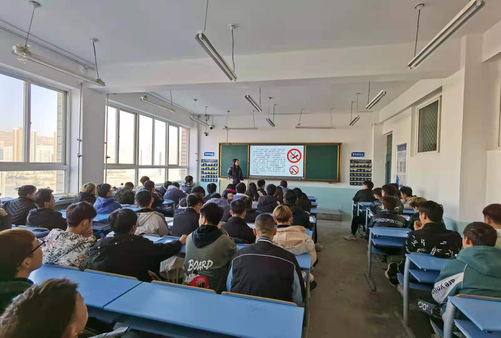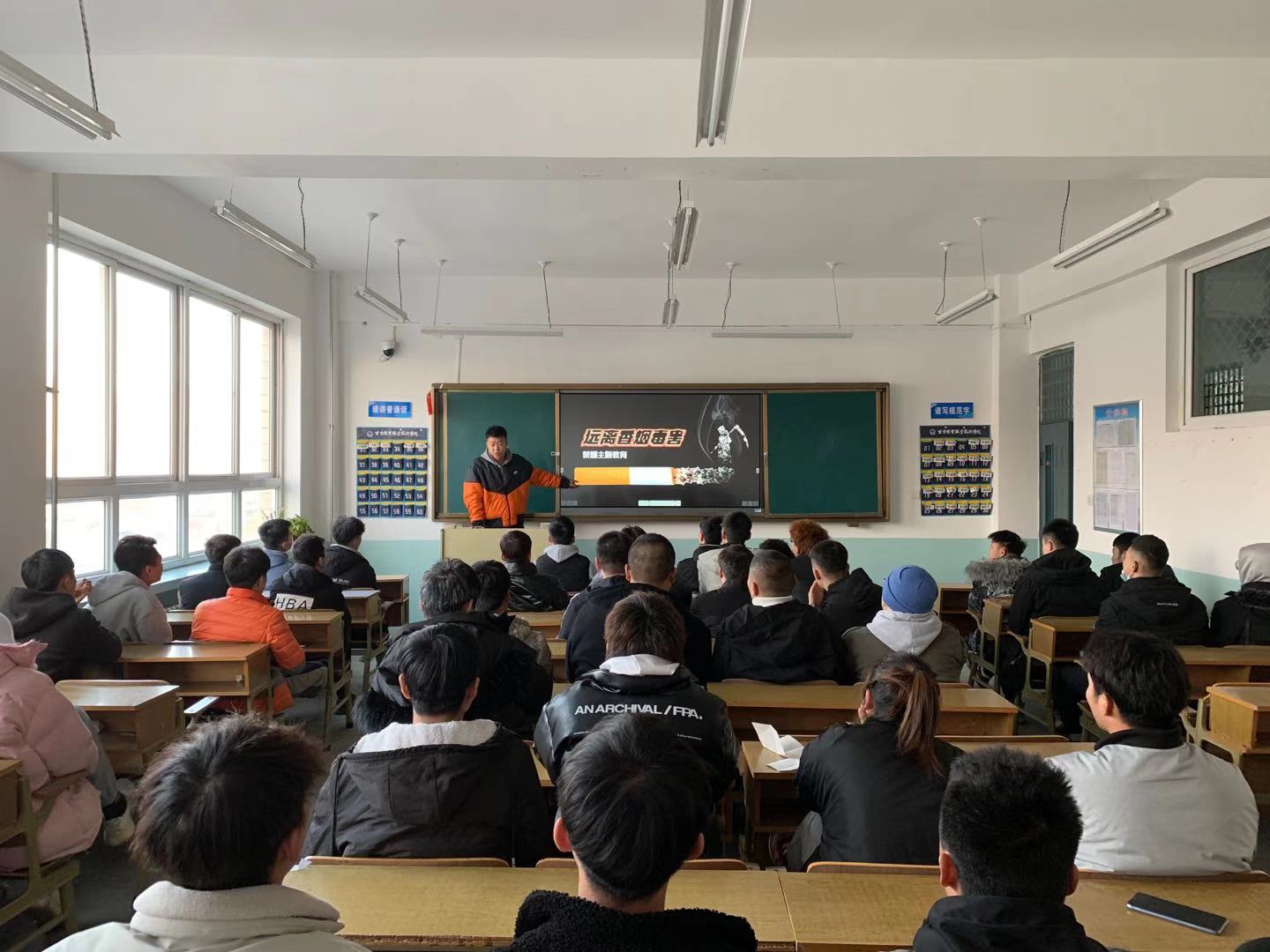 主题班会向全系学生发出倡议:让我们一起行动起来,使教室、寝室、食堂等公共场所不再“乌烟瘴气”,让烟蒂、烟盒在校园销声匿迹,还大家一个清新美好的校园环境,维护全校师生的身心健康,努力营造“人人懂得吸烟危害,人人参与禁烟活动”的良好氛围,让我们的校园真正成为无烟校园。