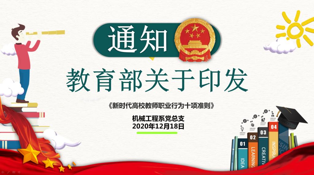 12月18日下午,机械工程系党总支组织机械工程系、教务处、图书馆全体教职员工召开了师德师风建设专题学习会,学习了习近平总书记关于高校意识形态工作的重要论述、教育部《新时代高校教师职业行为十项准则》、《教育部关于高校教师师德失范行为处理的指导意见》,对教育部公开曝光的8起违反教师职业行为十项准则典型问题进行了警示教育。