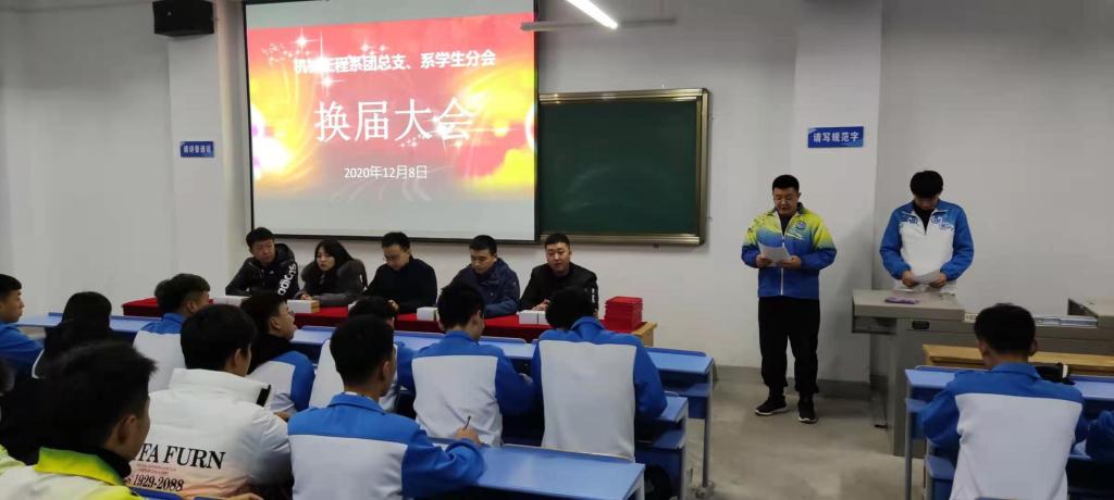机械工程系于2020年12月8日下午举行系学生分会换届大会。参加本次换届大会的人员有:机械工程系主任助理张宏乐、机械工程系学生管理干事王艳军、机械工程系团总支副书记寇西蒙、专职辅导员米龙、专职辅导员任燚、机械工程系团总支、学生会全体成员及各班班长、团支书。