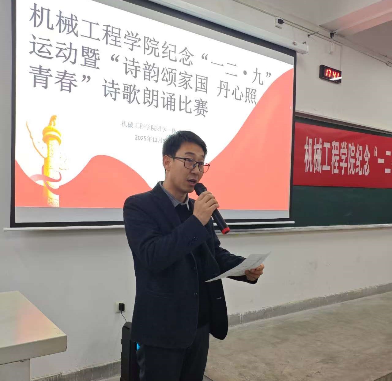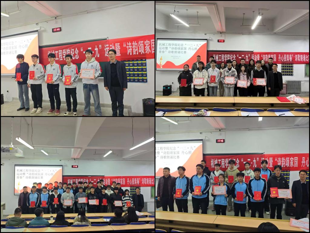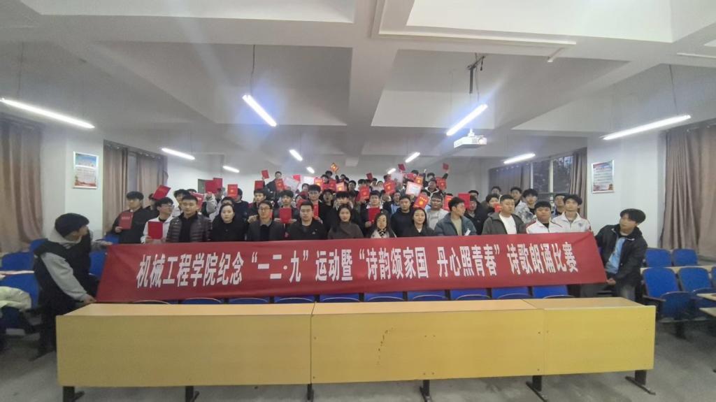 为深入学习宣传贯彻党的二十大精神,缅怀革命先烈,弘扬伟大爱国主义精神,激励青年学子铭记历史、担当使命,2025年12月9日,机械工程学院隆重举办纪念“一二·九”运动暨“诗韵颂家国 丹心照青春”诗歌朗诵比赛。学院党总支副书记周建军、学生干事王艳军及全体辅导员出席活动,近百名学生现场观看,共同参与这场融思想性、艺术性与教育性于一体的青春盛会。