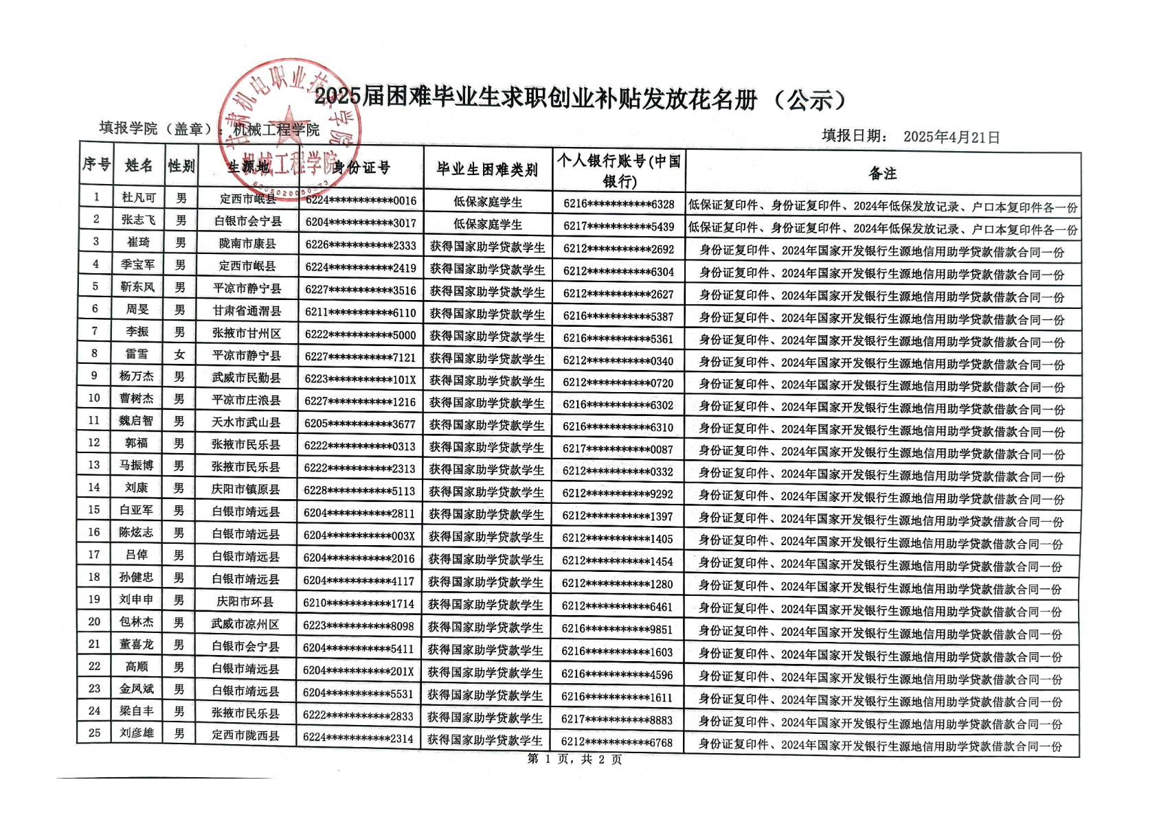 根据《甘肃省人力资源和社会保障厅、甘肃省教育厅、甘肃省财政厅、关于做好2025届困难毕业生求职创业补贴审核发放工作的通知》要求,机械工程学院全面开展了2025届困难毕业生求职创业补贴的宣传、填报和推荐工作,经学生本人申报、各班级民主评议小组审查、学院学生资助评定工作小组审核后,拟同意张志飞等50名学生初审通过困难生求职创业补贴,现予以公示,名单后附。