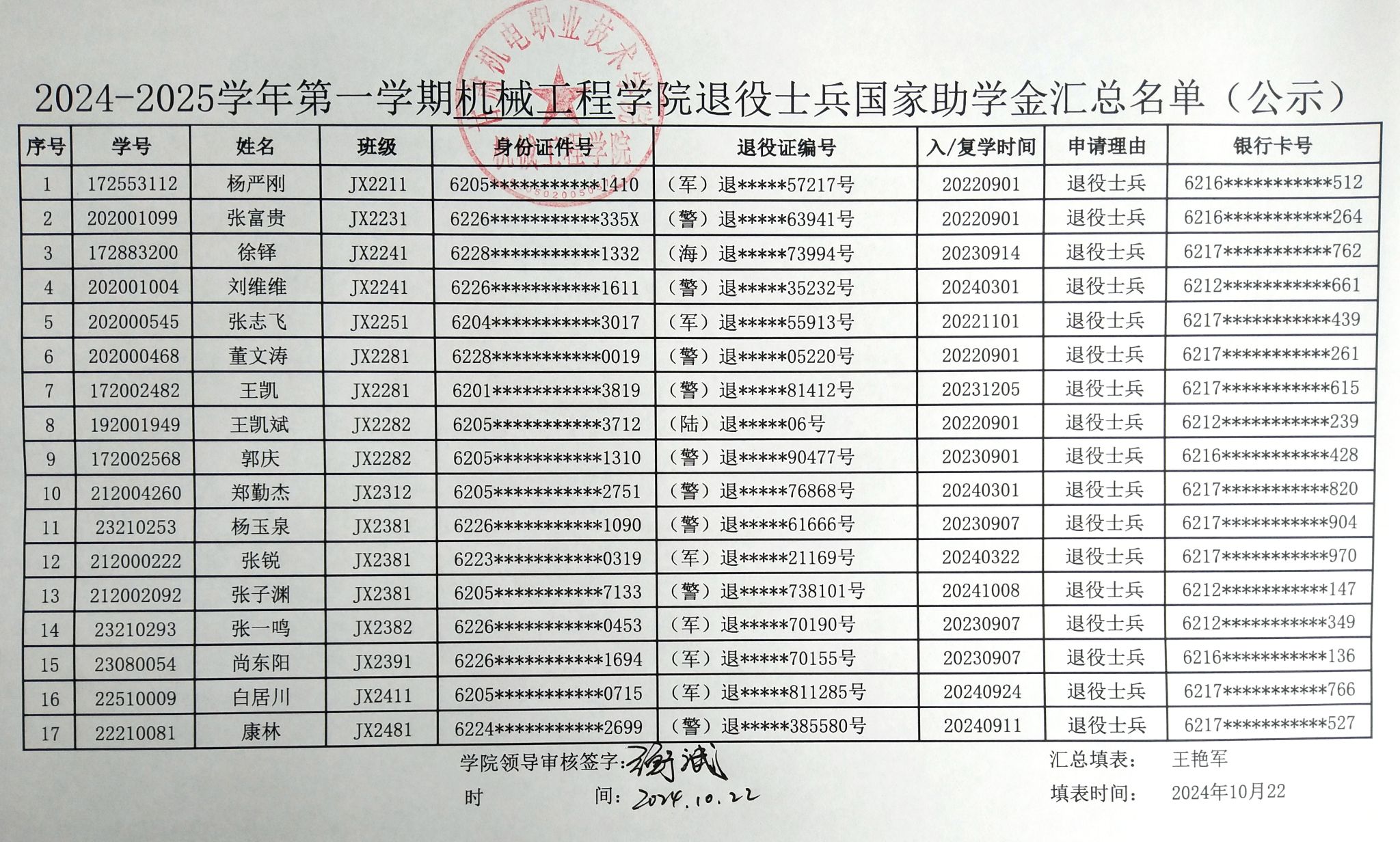 根据《甘肃机电职业技术学院关于2024年秋季学期在校退役士兵学生国家助学金申报等有关事项的通知》要求,机械工程学院结合实际情况,组织开展了全日制在校退役士兵学生国家助学金的评审认定工作。经学生个人申请,班级学生资助工作民主评议小组评议推荐,辅导员初审把关,机械工程学院学生奖助学金评审工作小组审核,党政联席会研究认定,拟推荐杨严刚等17名学生符合在校退役士兵学生国家助学金条件,现予以公示,名单附件如下。