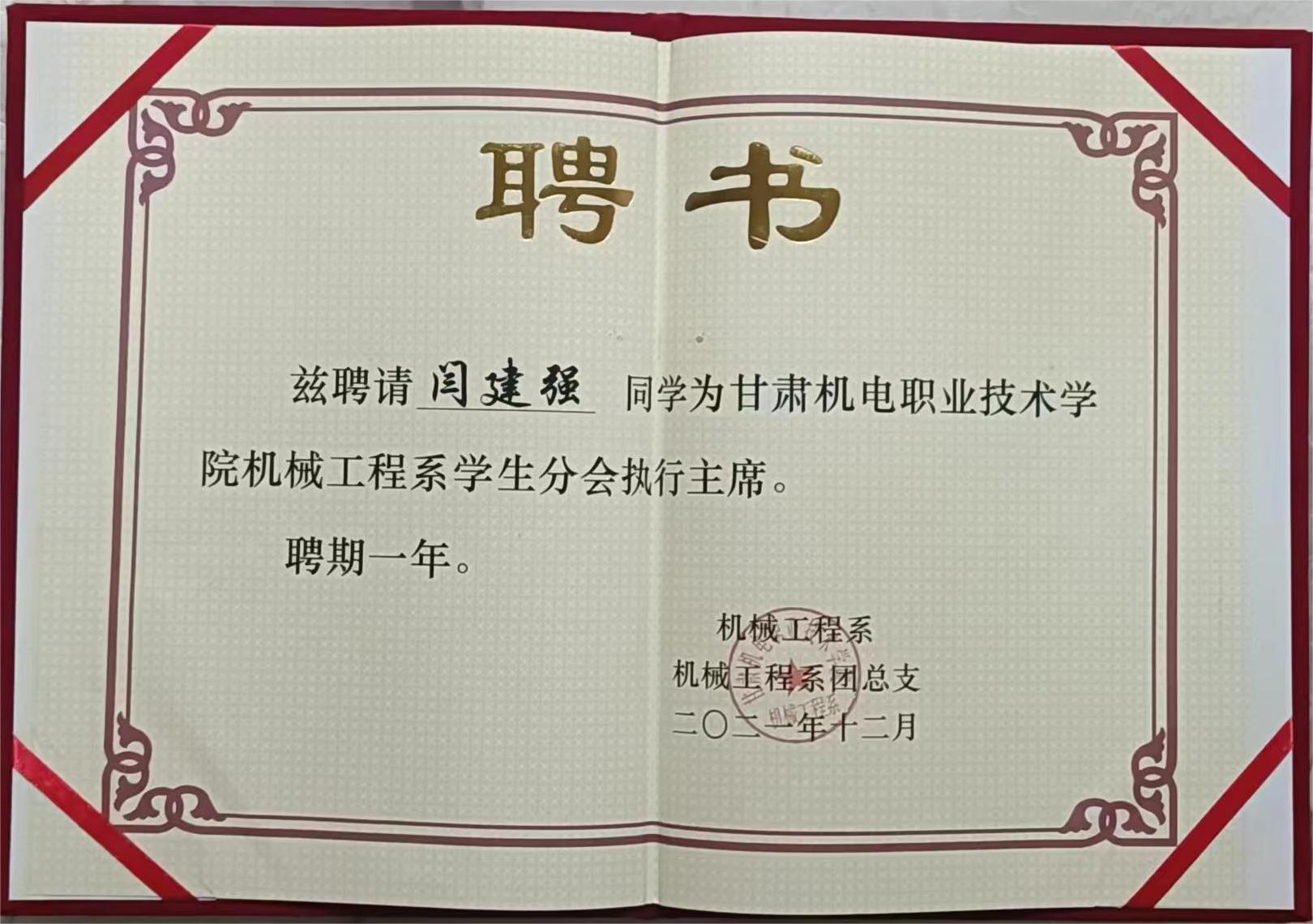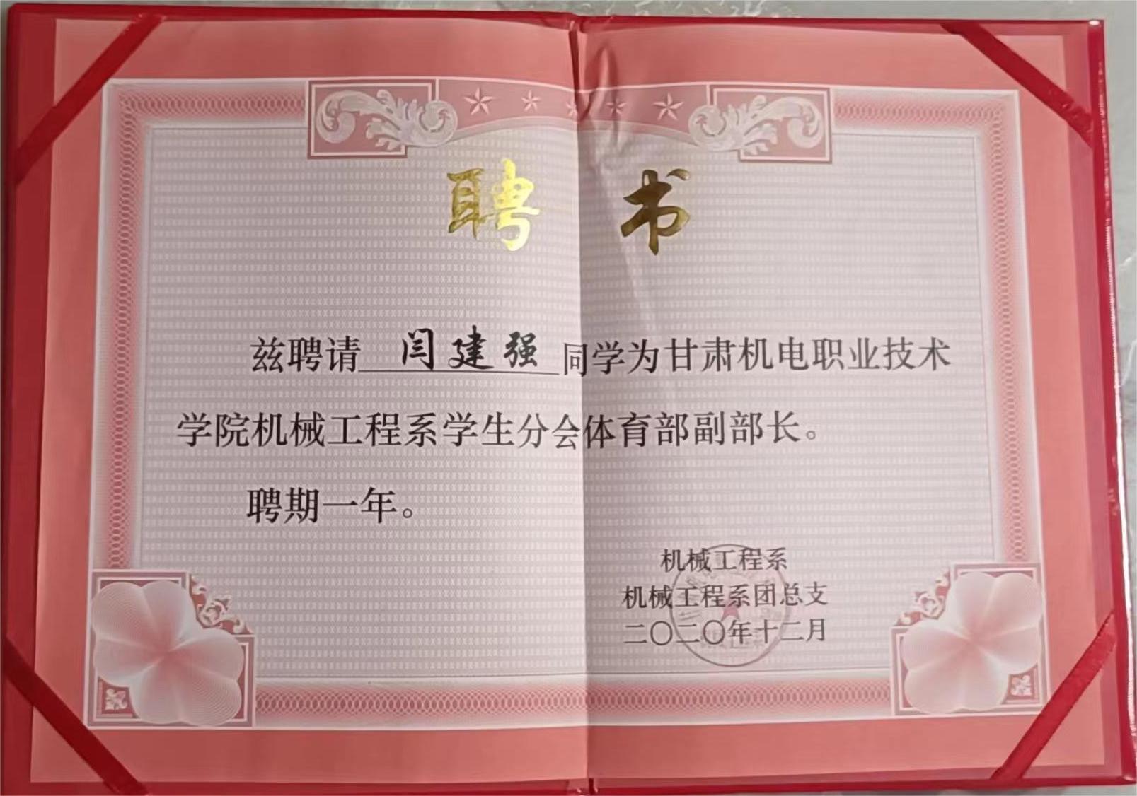 我是机械工程学院JX2042班闫建强,现担任甘肃机电职业技术学院,机械工程学院学生会主席。自从入校以来,本人一直积极进取,充满激情,在思想、学习、活动、生活上都严要求自己,因为我知道,今天的成就来自昨天的努力,明天的辉煌必须从今天开始创造。本人严格遵守学院的各项规章制度,做好模范带头作用。平时能够妥善处理好班级工作与学生会工作之间的关系。在大学学习中,我严格要求自己积极进取,在老师和同学鼓舞的帮助下,我在学习思想,工作等各方面,较为优秀的成绩,收获颇多,曾被评为“优秀学生干部 ”,“优秀十佳青年学子”,同时我的工作也得到了老师和同学的认可。
