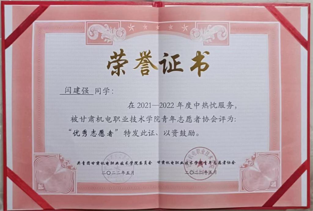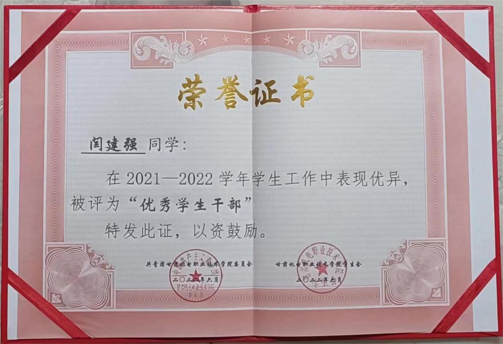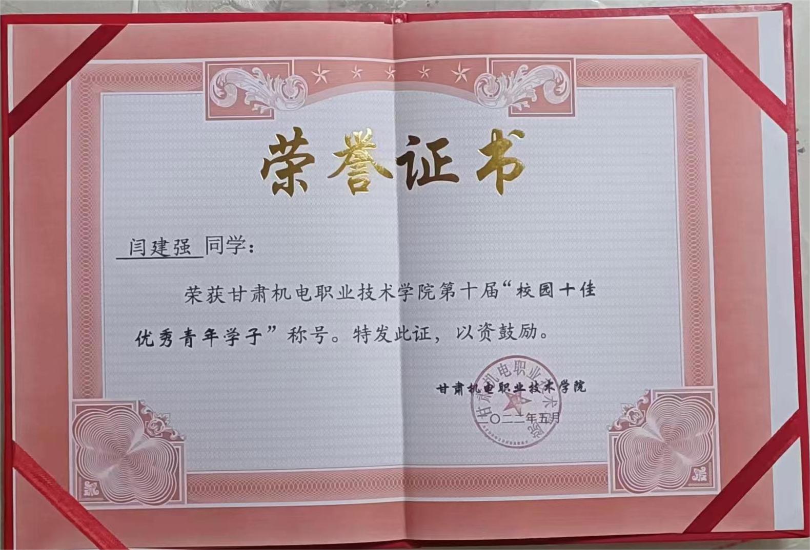 2022 年年度荣获甘肃机电职业技术学院“十佳杰出青年”荣誉称号;