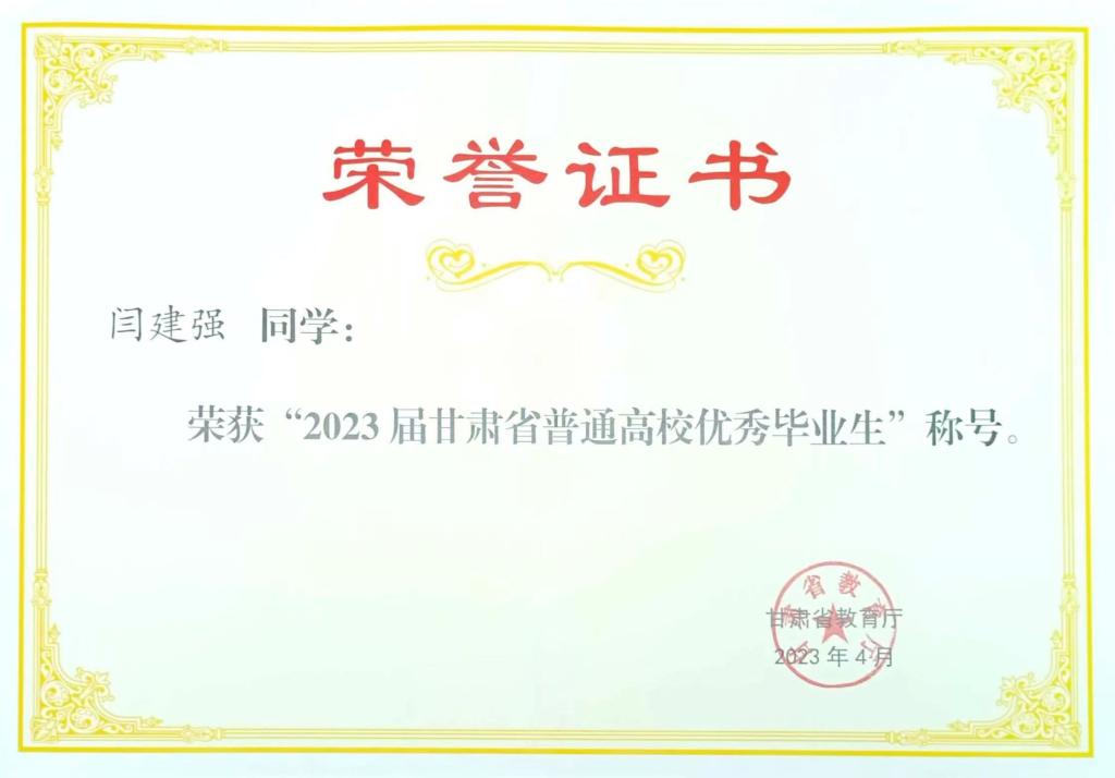 2023年4月获2023届“甘肃省高校优秀毕业生”荣誉称号。