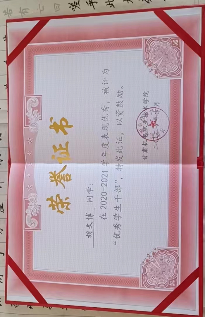 2020-2021年度荣获学院“优秀学生干部”称号。