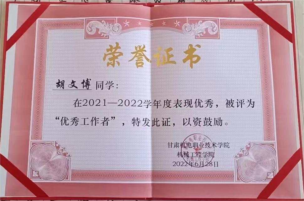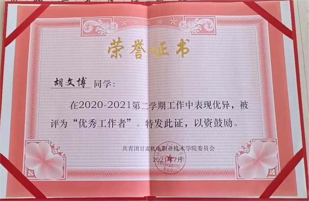 2020-2021年度在第二学期学生工作中表现优异被评为“优秀工作者”。