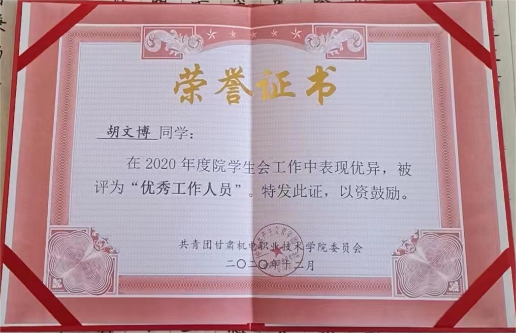 2020年度在学生工作中表现优异被评为“优秀工作人员”。