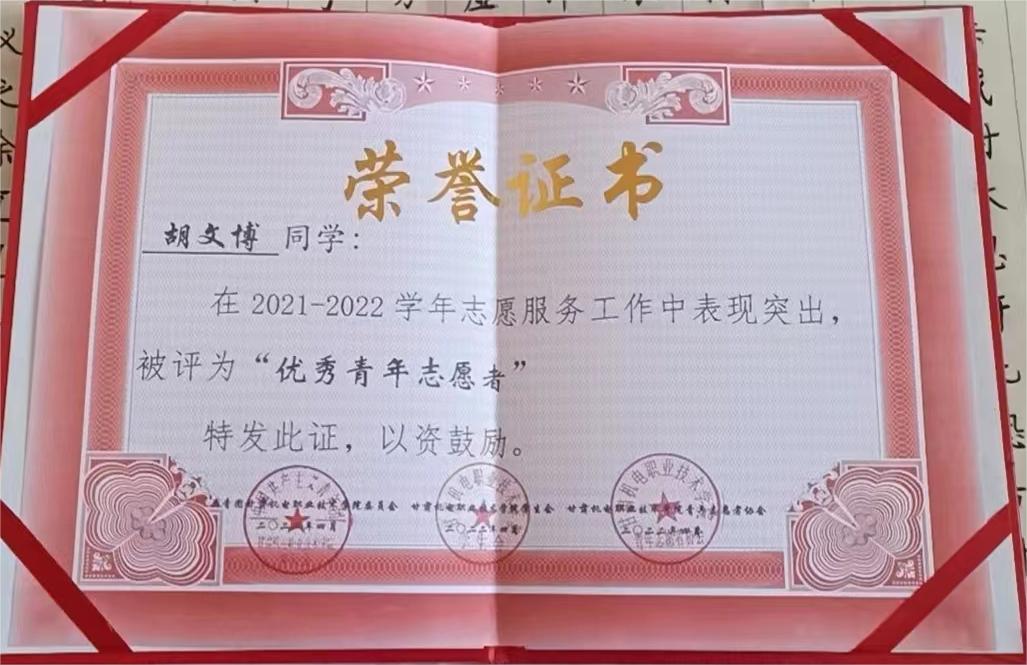 2021-2022学年志愿服务工作中表现突出被评为“优秀青年志愿者”。