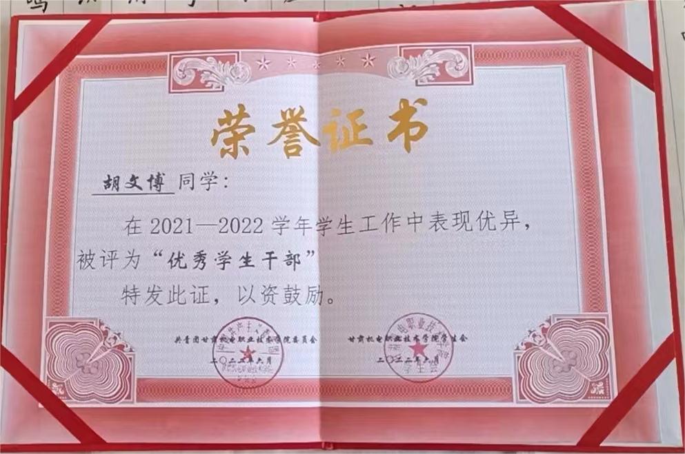 2021-2022学年在学生工作中表现优异被评为“优秀学生干部”。