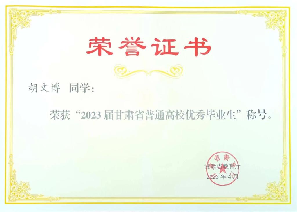 2023年4月获2023届“甘肃省高校优秀毕业生”荣誉称号。