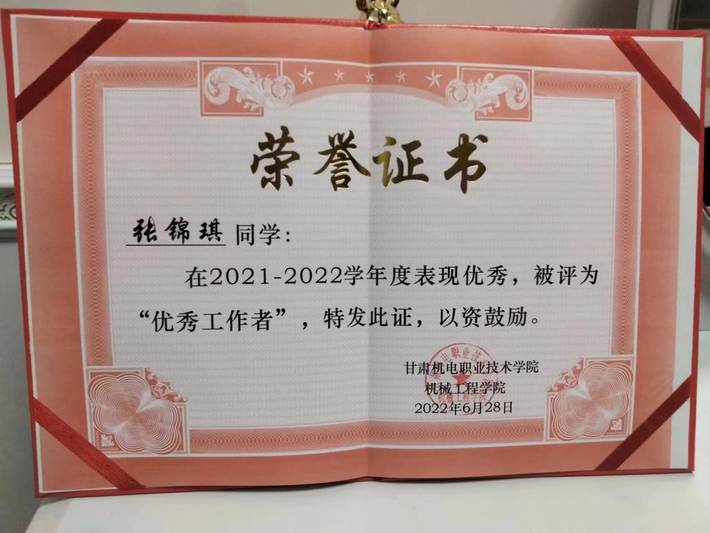 2022年6月获甘肃机电职业技术学院“优秀工作者”荣誉称号;
