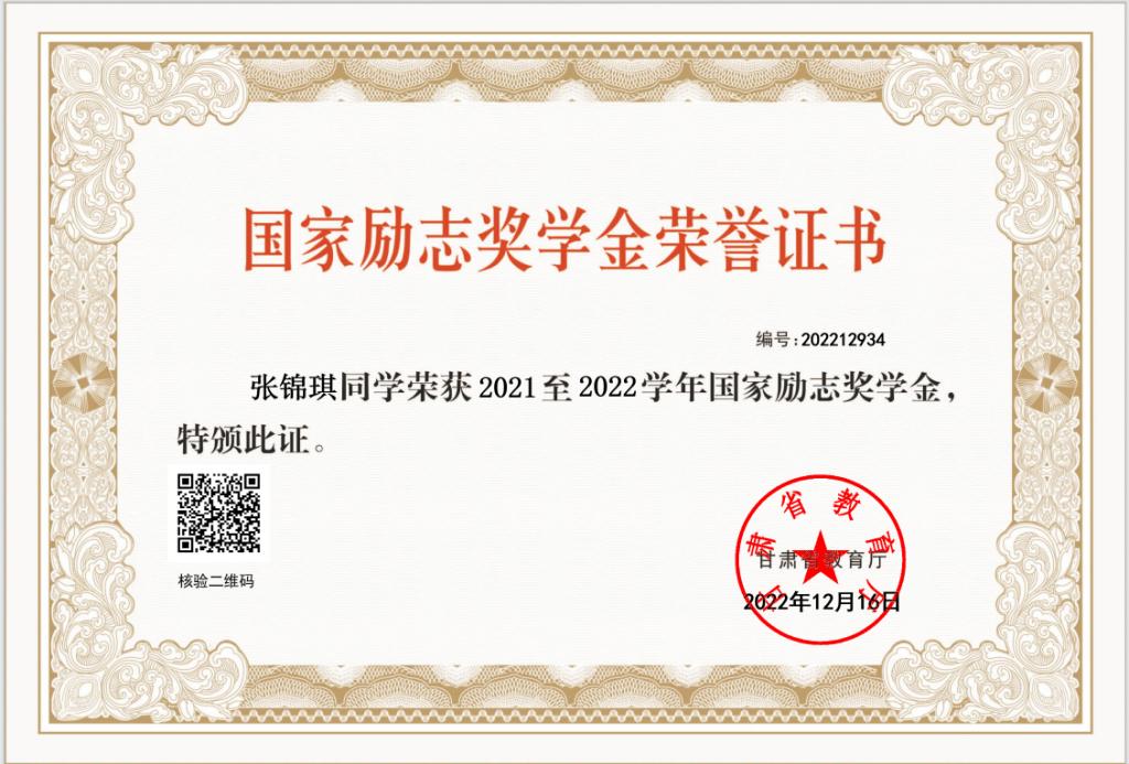 2022年12月获国家励志奖学金;