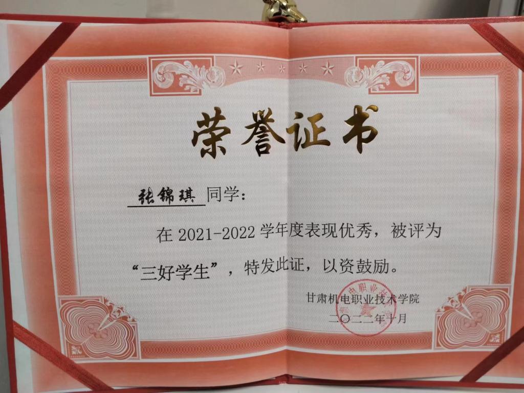 2022年10月获甘肃机电职业技术学院“三好学生”荣誉称号;