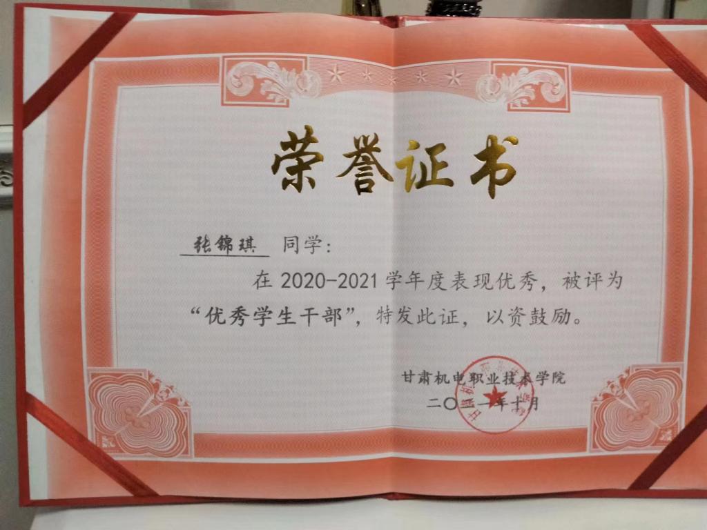 2021年10月获甘肃机电职业技术学院“优秀学生干部”荣誉称号;