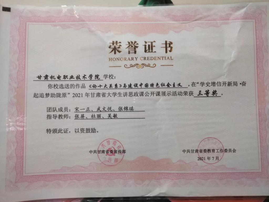 2021年7月在“学史增信开新局·奋起追梦助陇原”甘肃省大学生讲思政课公开课展示活动荣获三等奖;