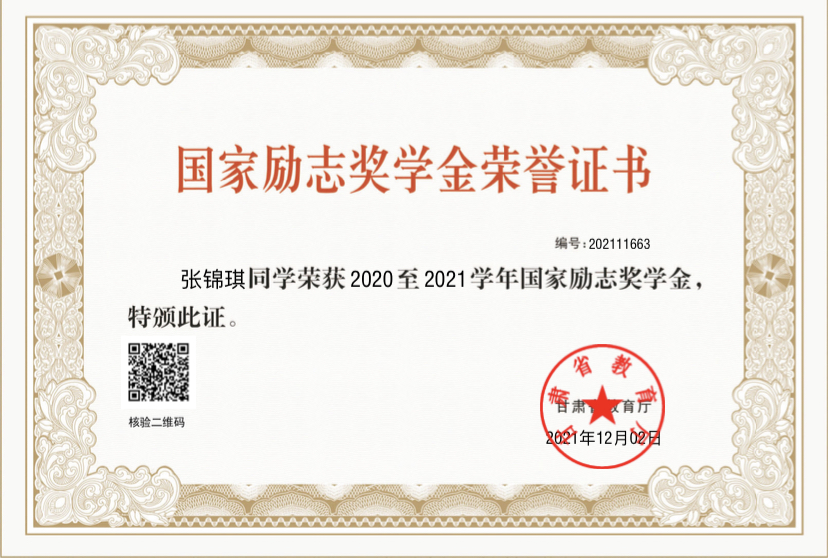 2021年12月获国家励志奖学金;
