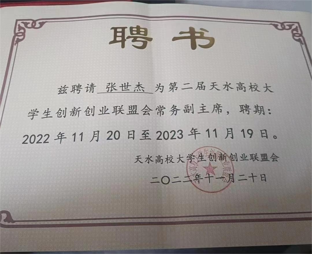 2022年12月获聘天水高校大学生创新创业联盟会常务副主席;