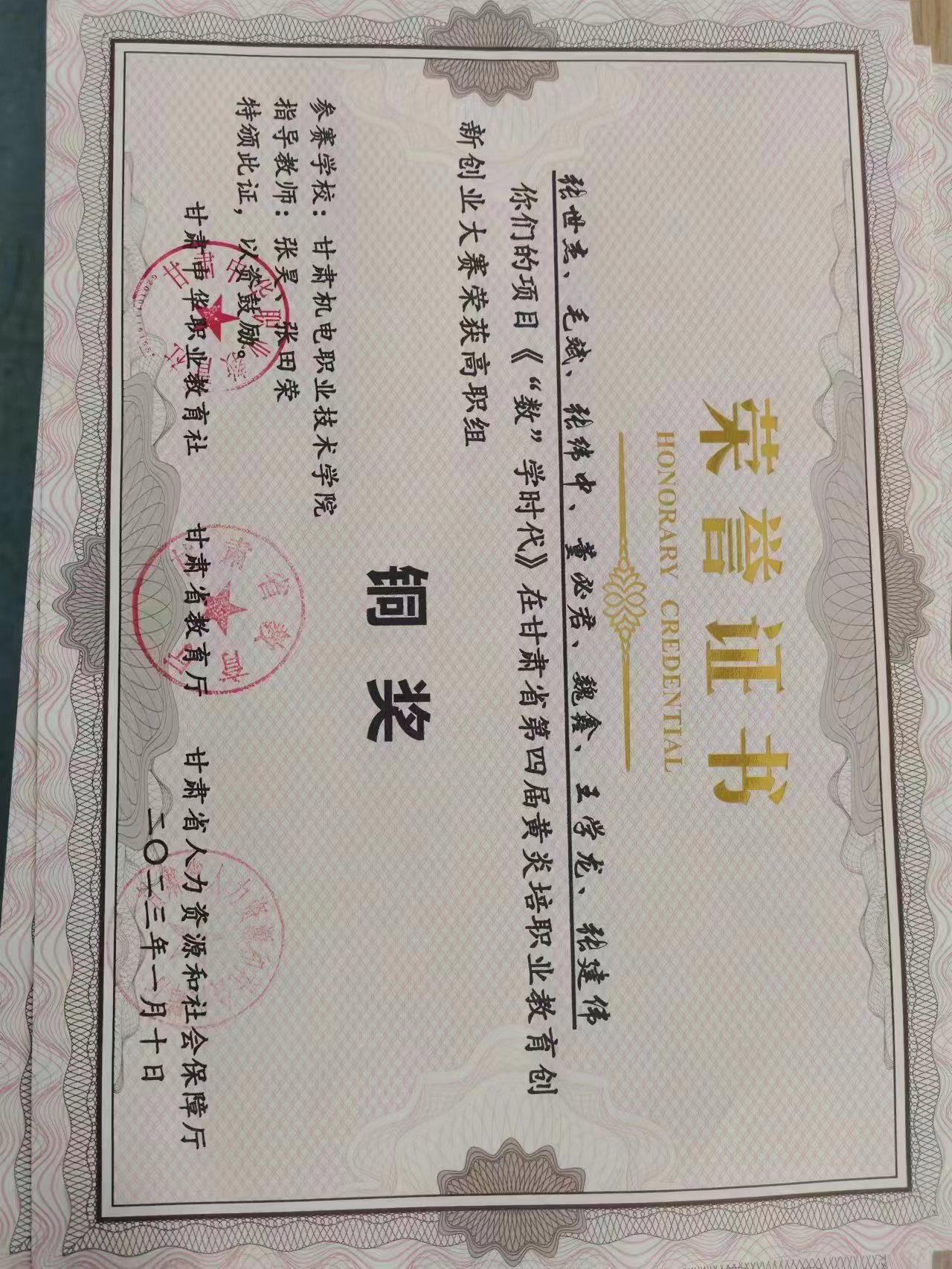 2023年1月获得甘肃省第四届黄炎培职业教育创新创业大赛铜奖;