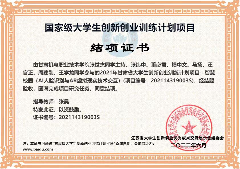 2022年8月获得第八届中国国际“互联网+”创新创业大赛甘肃赛区“金奖”;