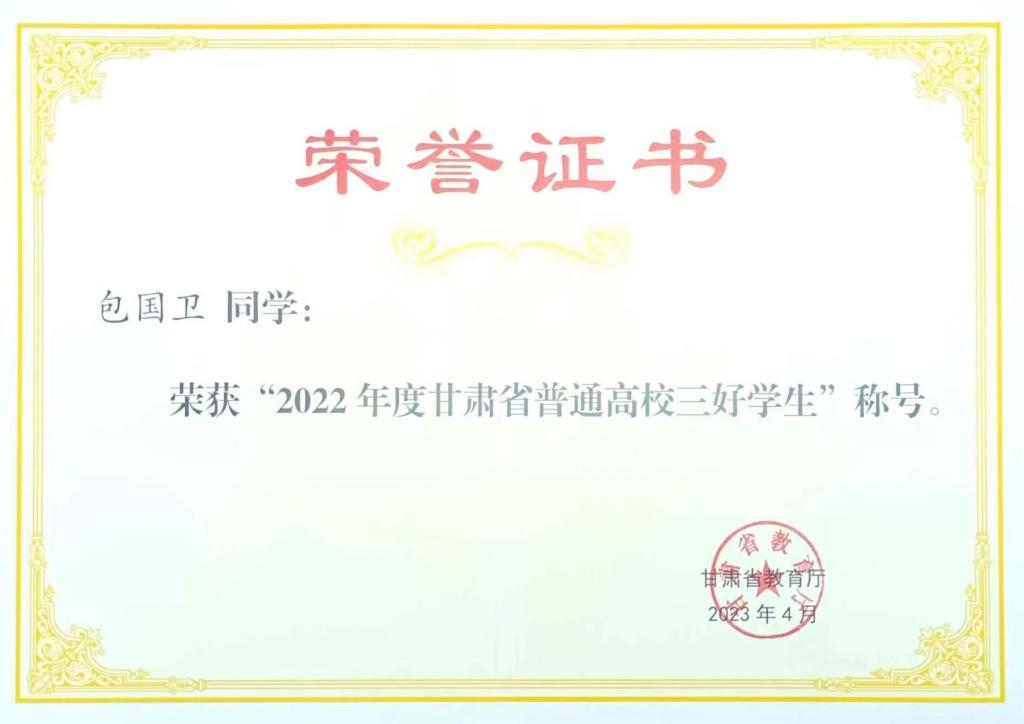 2023年4月获得甘肃省“三好学生”荣誉称号。