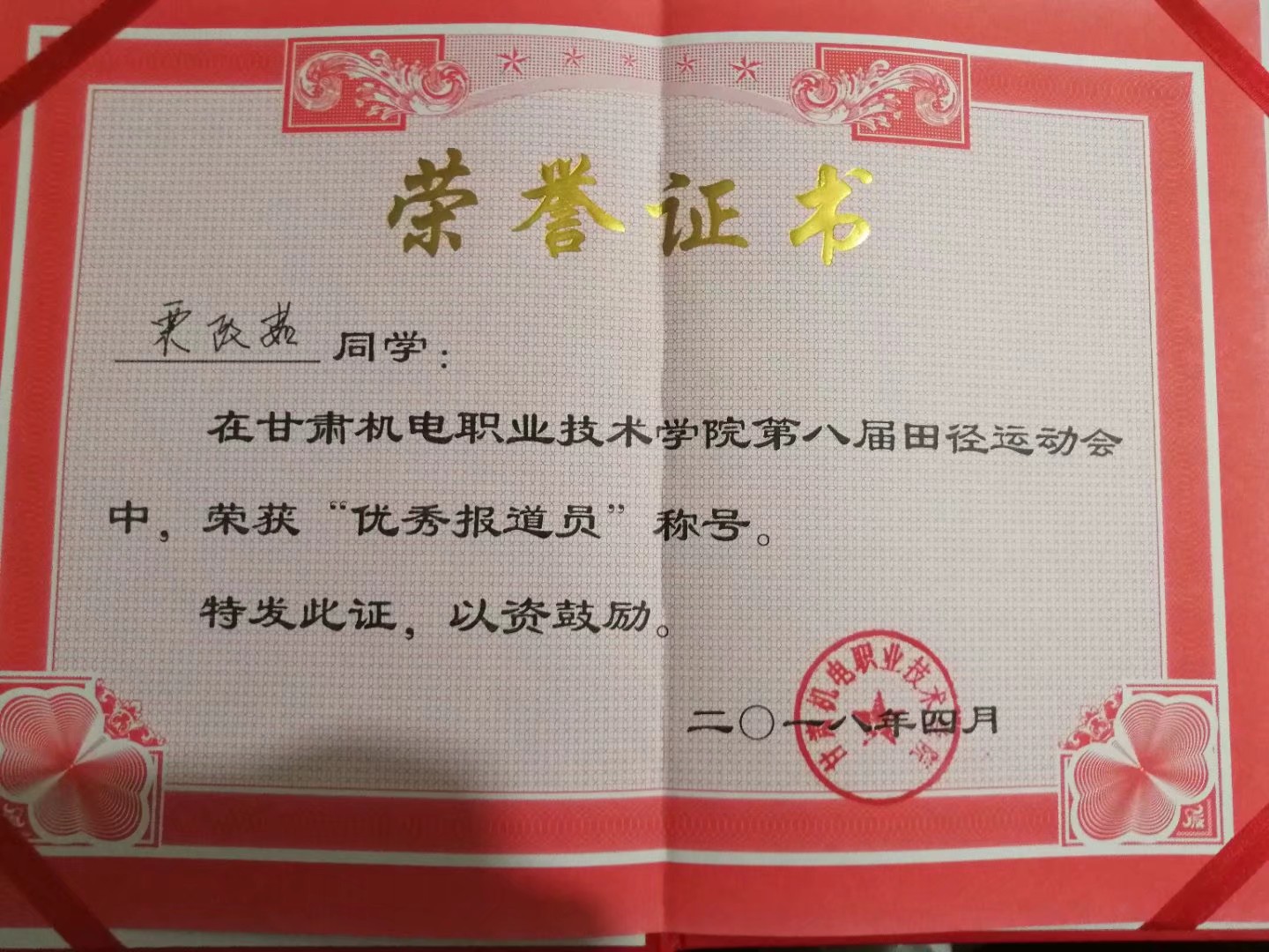 2018年甘肃机电职业技术学院第八届田径运动会“优秀报道员”