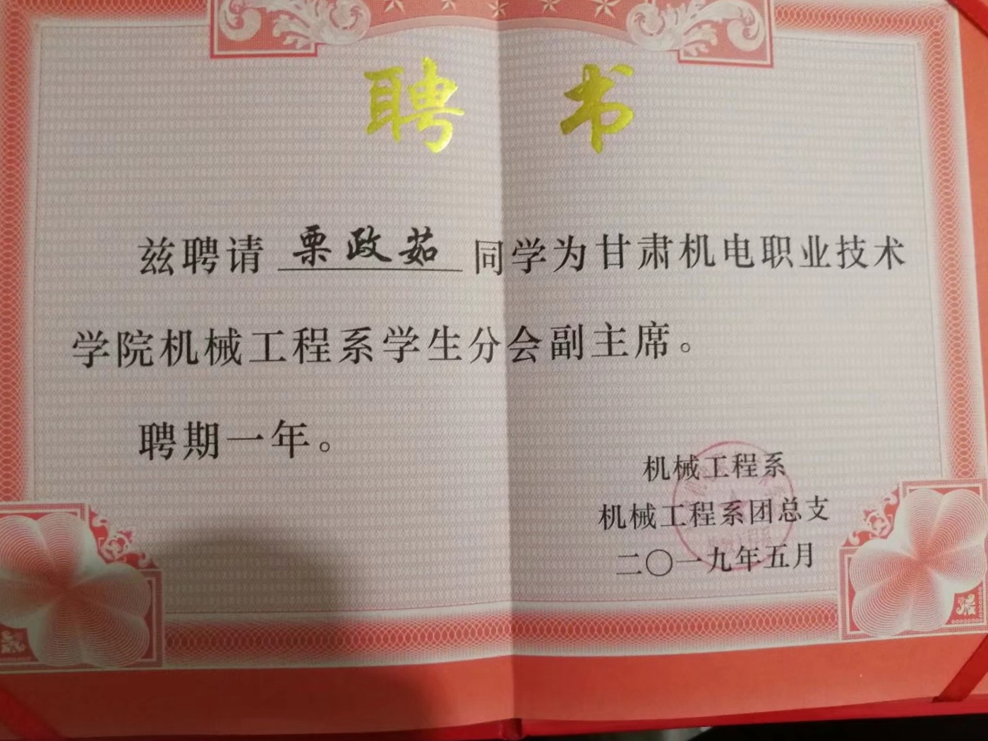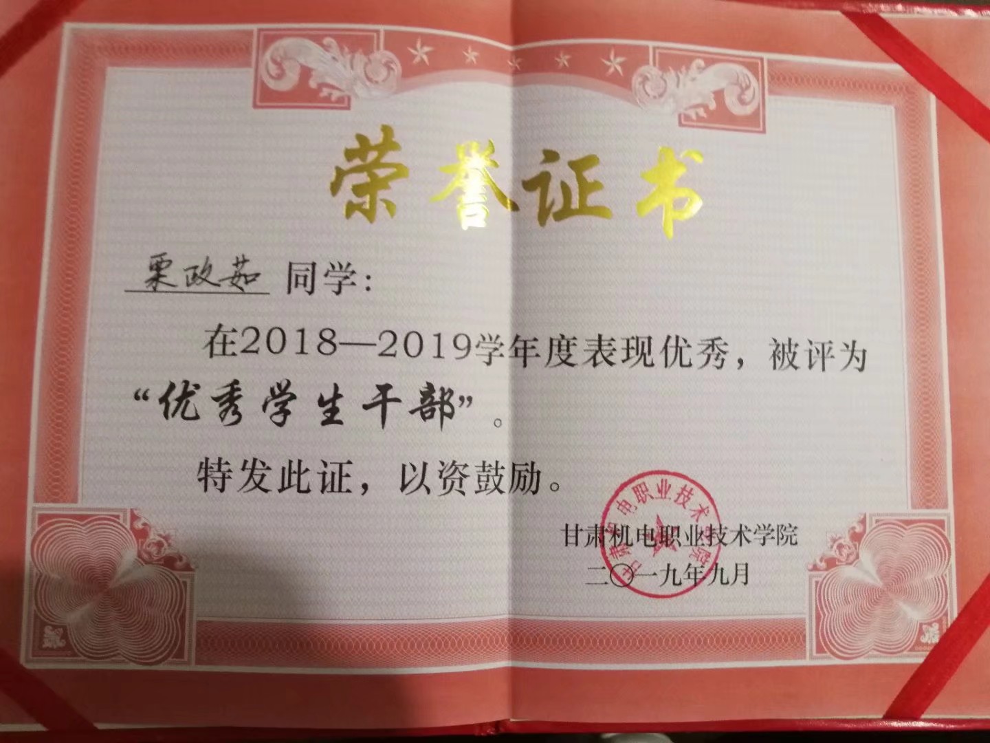 栗政茹,女,中共预备党员,机械工程系数控技术专业JX1783班学生。经学院推荐,甘肃省教育厅授予栗政茹同学“2020届甘肃省普通高校优秀毕业生”荣誉称号。