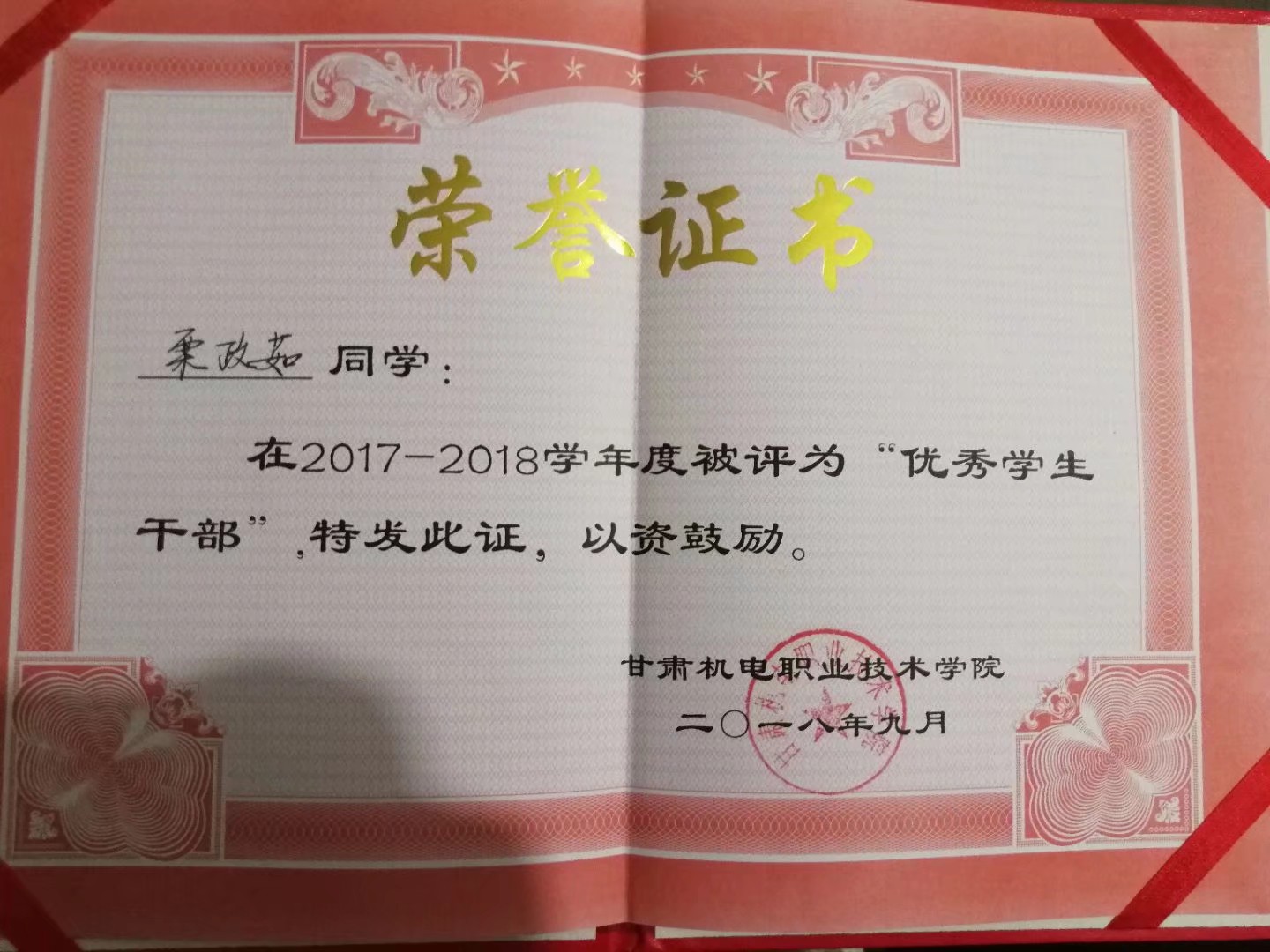 2017-2018学年度被评为“优秀学生干部”