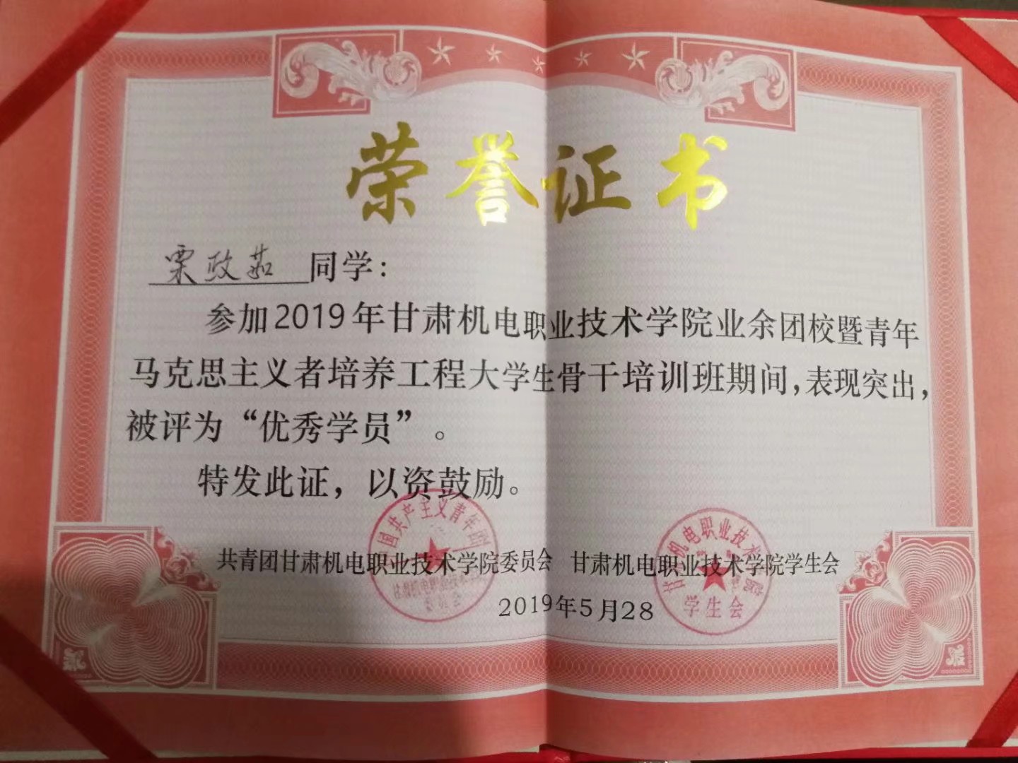 2019年度甘肃机电职业技术学院业余团校暨青年马克思主义培养工程大学生骨干培训班“优秀学员”