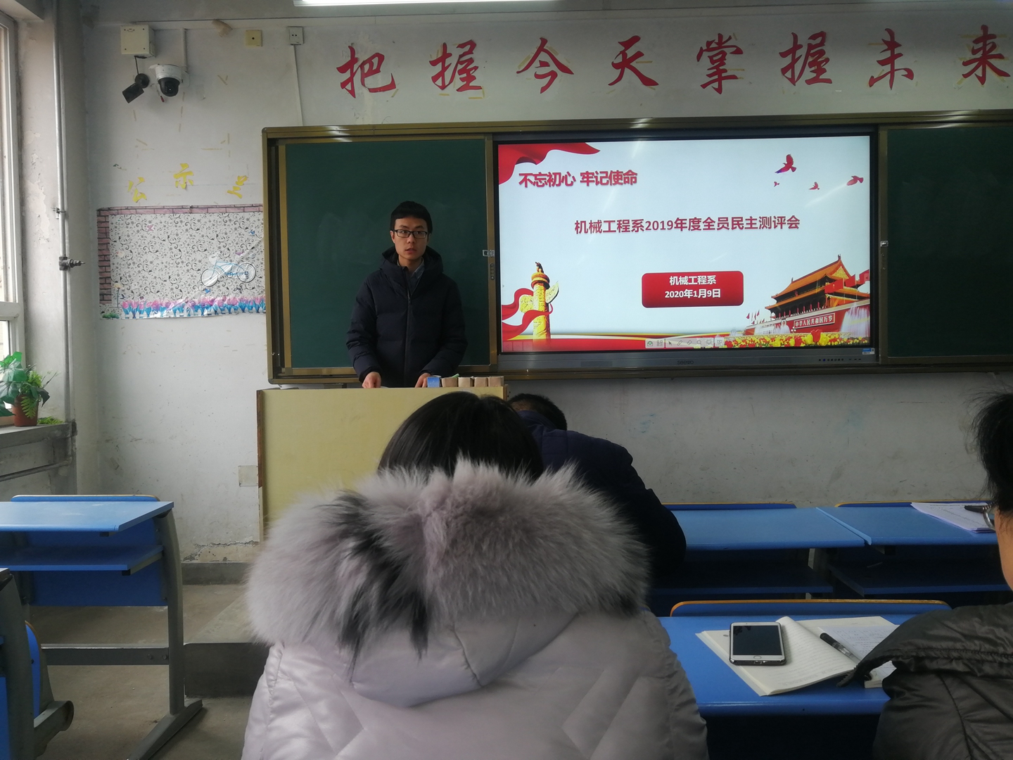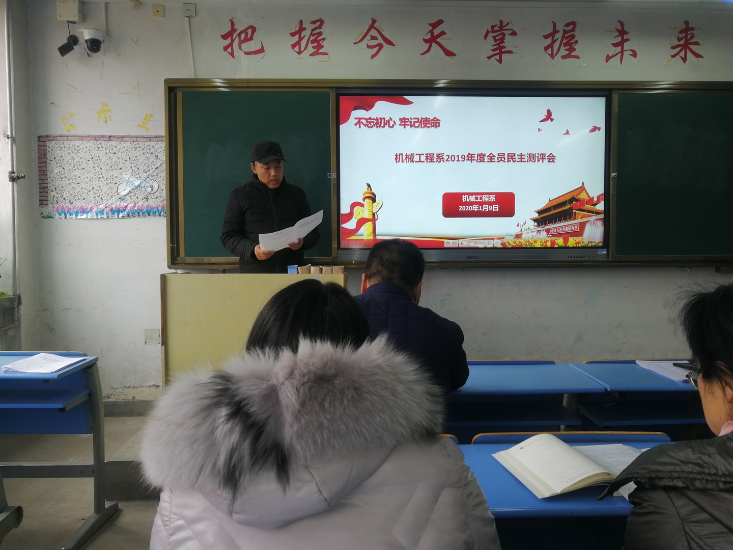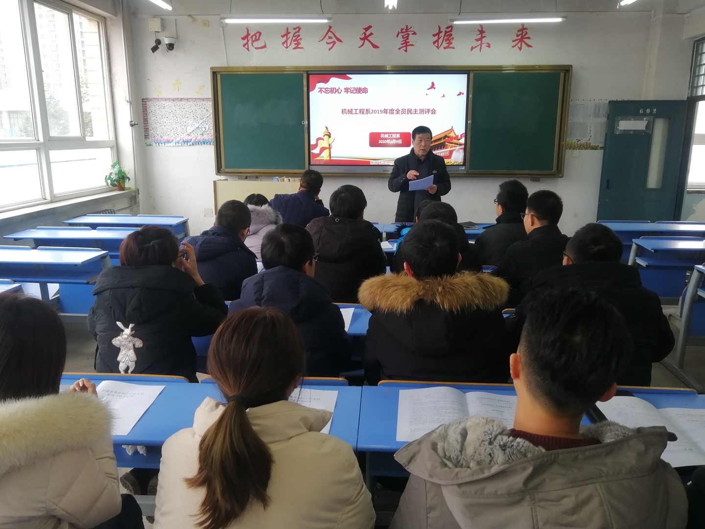 回首2019年,学校办学水平整体提升,师资力量不断加强,教学质量不断提升,管理水平不断加强,学校的各项工作已逐渐夯实基础。总结过去,展望未来。为了让全体教职工清楚我们2019年的成绩,明确我们2020年的目标,让系部更好地发展,1月9日下午,机械工程系在2号教学楼602召开了2019年度全员民主测评暨述职报告会。机械工程系全体教职工共26人参加会议。会议系主任焦太安由主持。