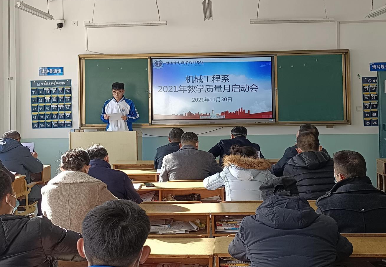 为确保学院2021年“教学质量月”活动的有效开展与落实,切实加强活动的组织推进,机械工程系成立活动组织小组,围绕“有效教学、高效学习”主题,对标学院部署,广泛动员全系师生“人人参与、人人行动、人人宣传”,2021年11月30日下午,在2-502教室召开了2021年“教学质量月”活动启动会。学院党委副书记、院长赵彦军、教务处处长孙永忠、学工部部长廖天滨、机械工程系全体专兼职教师及学生代表参加了会议。