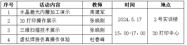 机械工程学院2024 年职业教育活动周,3D打印体验活动安排表。