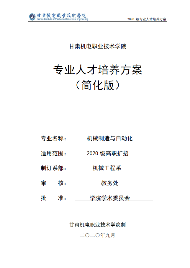 2020级《机械制造与自动化》高职扩招专业人才培养方案(简化版).pdf