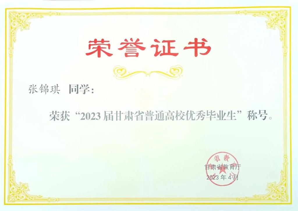 2023年4月获2023届“甘肃省高校优秀毕业生”荣誉称号。