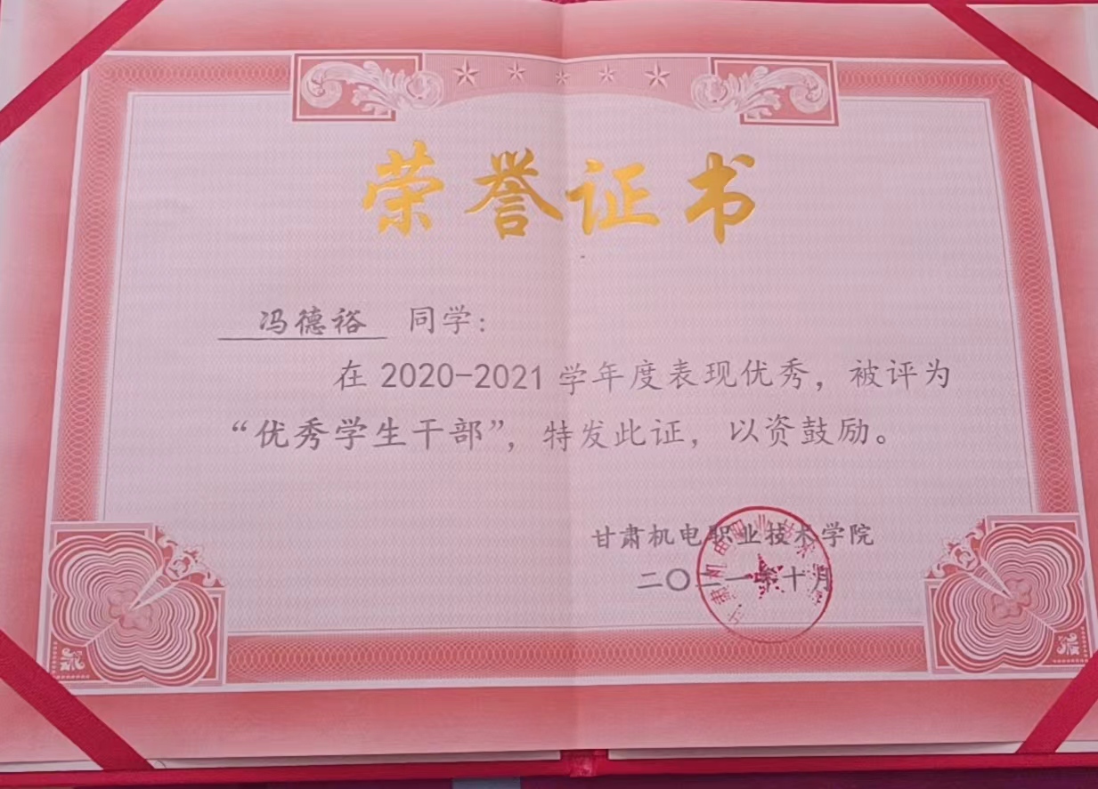 2021年10月,被评为甘肃机电职业技术学院 “优秀学生干部”荣誉称号;